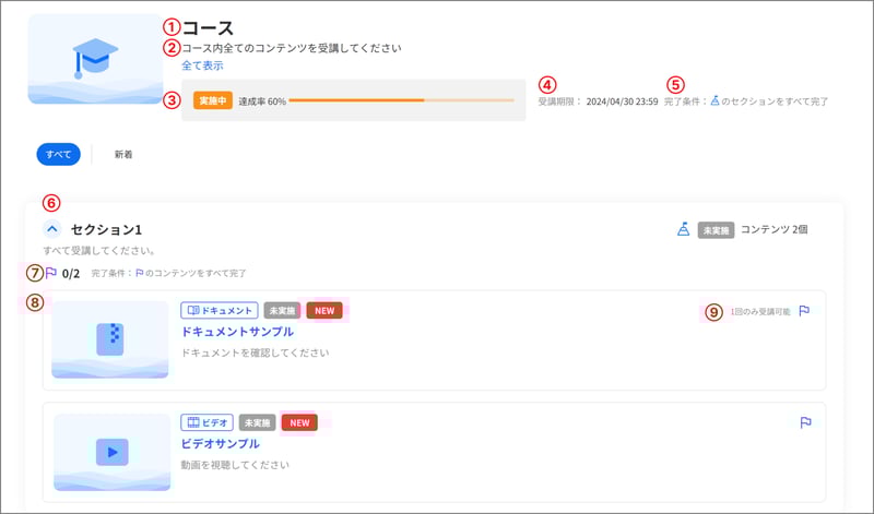 ③コース説明 コース説明が表示されます。コース説明が長い場合は、カーソルを合わせると全文表示されます。 |