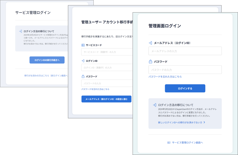 今までサービスコード・ログインID・パスワードでログインしていた旧管理ユーザーは、アップデート後の画面上で移行手続きが可能です。現在の権限や閲覧制限などを引き継いだ状態で移行しますのでご安心ください。