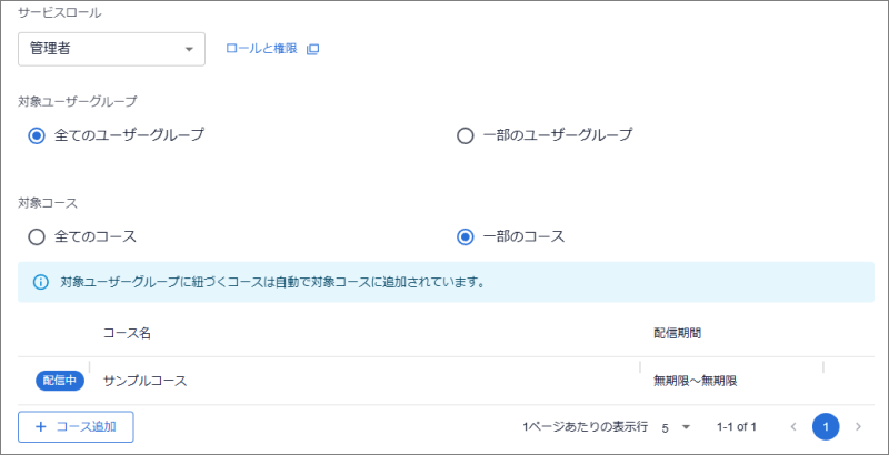 管理ユーザーごとに、ユーザーグループ・各コースへのアクセス権限を割り当てます。